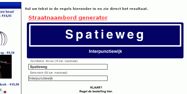 Op www.gadgethouse.nl kun je je persoonlijke straatnaambord bestellen. Bij het zien van de 'straatnaambord generator' kwam er meteen een toepasselijke straatnaam in me op...