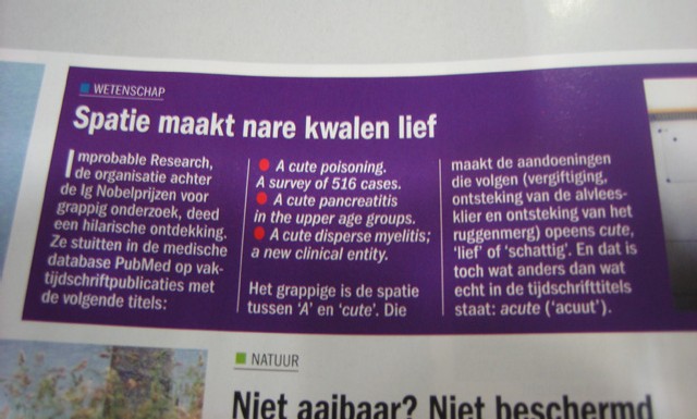 "Improbable Research, de organisatie achter de Ig Nobelprijzen voor grappig onderzoek, deed een hilarische ontdekking. Ze stuitten in de medische database PubMed op vaktijdschriftpublicaties met de volgende titels: 'A cute poisoning. A survey of 516 cases.', 'A cute pancreatis in the upper age groups' en 'A cute disperse myelitis; a new clinical entry'. Het grappige is dat de spatie tussen 'A' en 'cute'. Die maakt de aandoeningen die volgen opeens cute ('lief' of 'schattig'). En dat is toch wat anders dan wat echt in de tijdschrifttitels staat: acute ('acuut')."